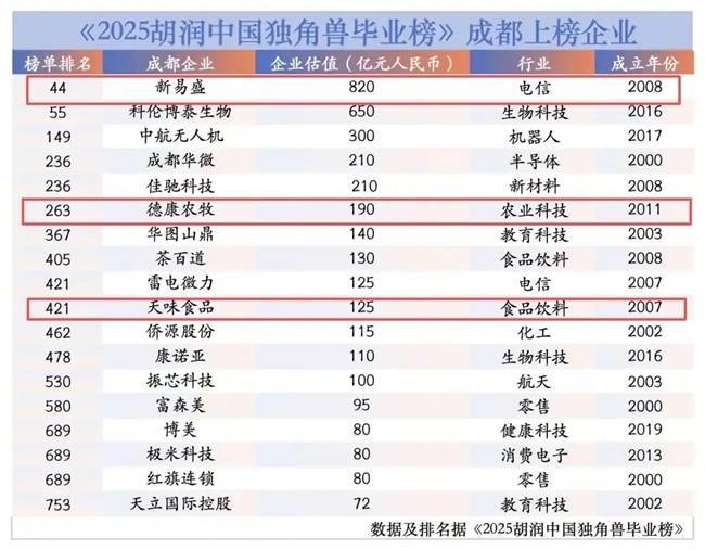 近日,胡润研究院首次发布《2025胡润中国独角兽毕业榜》,列出了中国成立于2000年之后、价值超过10亿美元的上市企业。在全国796家上榜企业中,成都双流区有3家企业,分别是新易盛、德康农牧和天味食品。